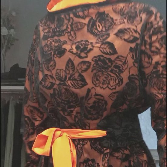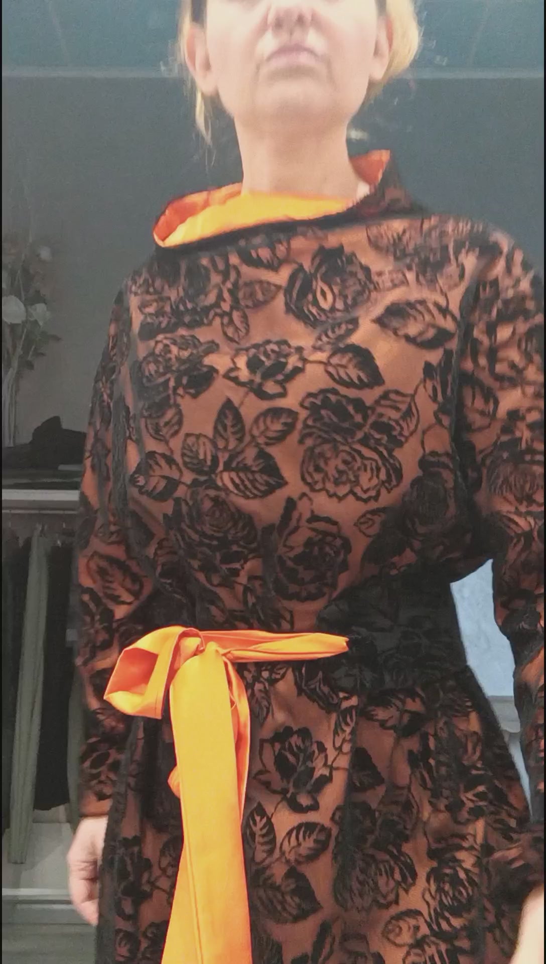 Abito in tulle floccato doppiato con raso di viscosa. Ha il collo a vulcano lasciato morbido, che ripiega un po' sul davanti