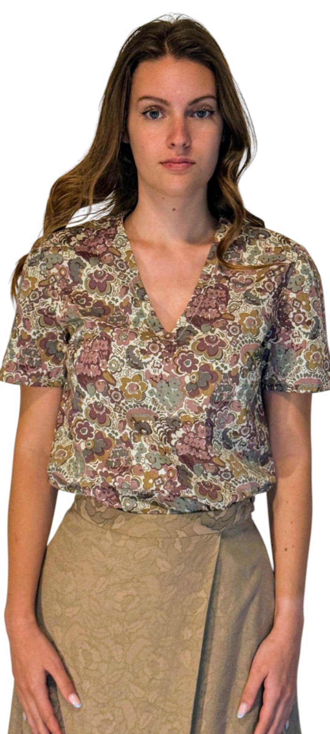 La modella è alta 1,80 m, è una tg. 42 di seno ed indossa la tg. 42 lunghezza Media fantasia a fiori (capo campione disponibile in tre giorni lavorativi per la spedizione. Le misure del capo campione sono le seguenti: crf. seno 96cm, crf. vita 92cm, crf. fondo 96cm, lunghezza da spalla a fondo 60cm, lunghezza manica 21cm).