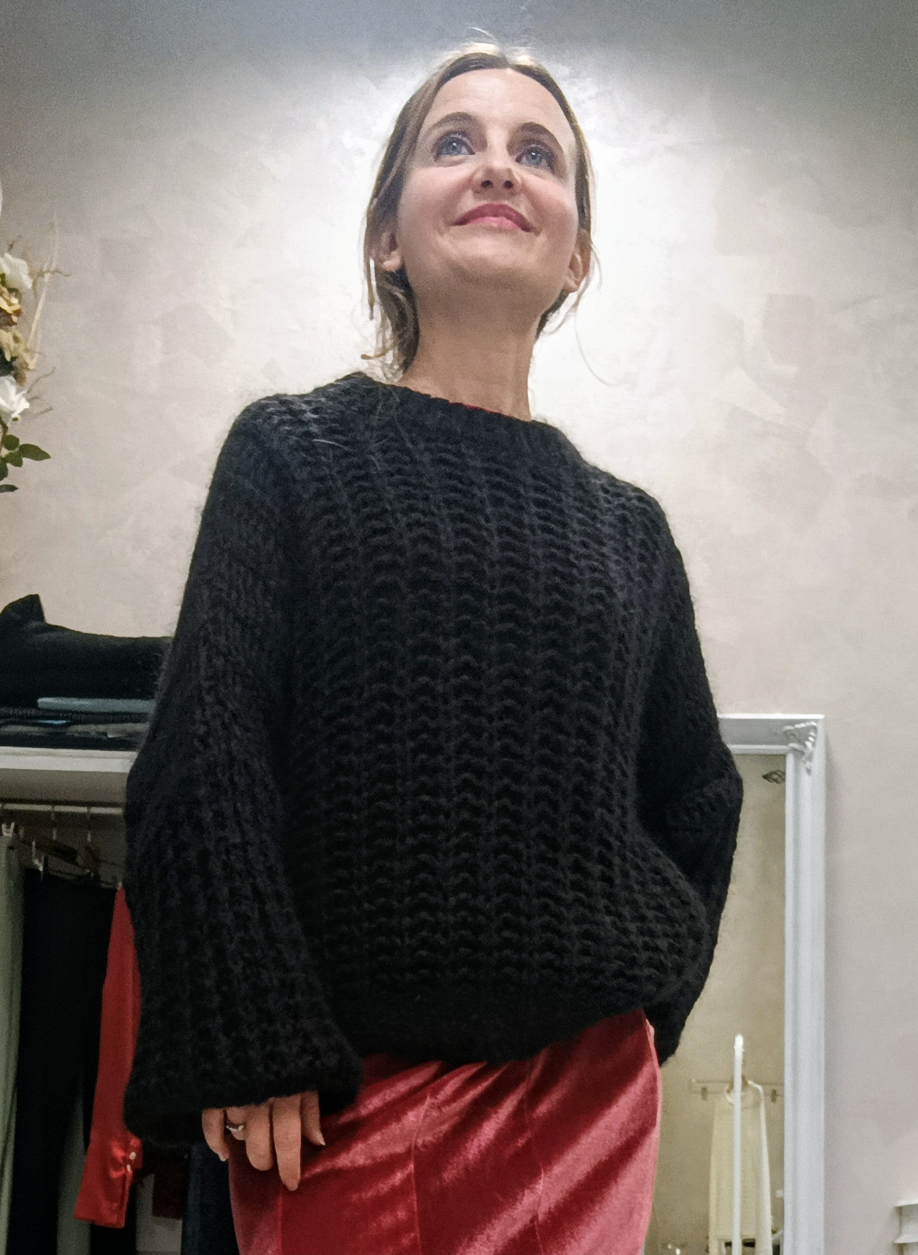 Questo maglione dalla linea over è realizzato in calda lana mohair, spalle molto basse e manica ampia trattenuta da un elastico al fondo.
