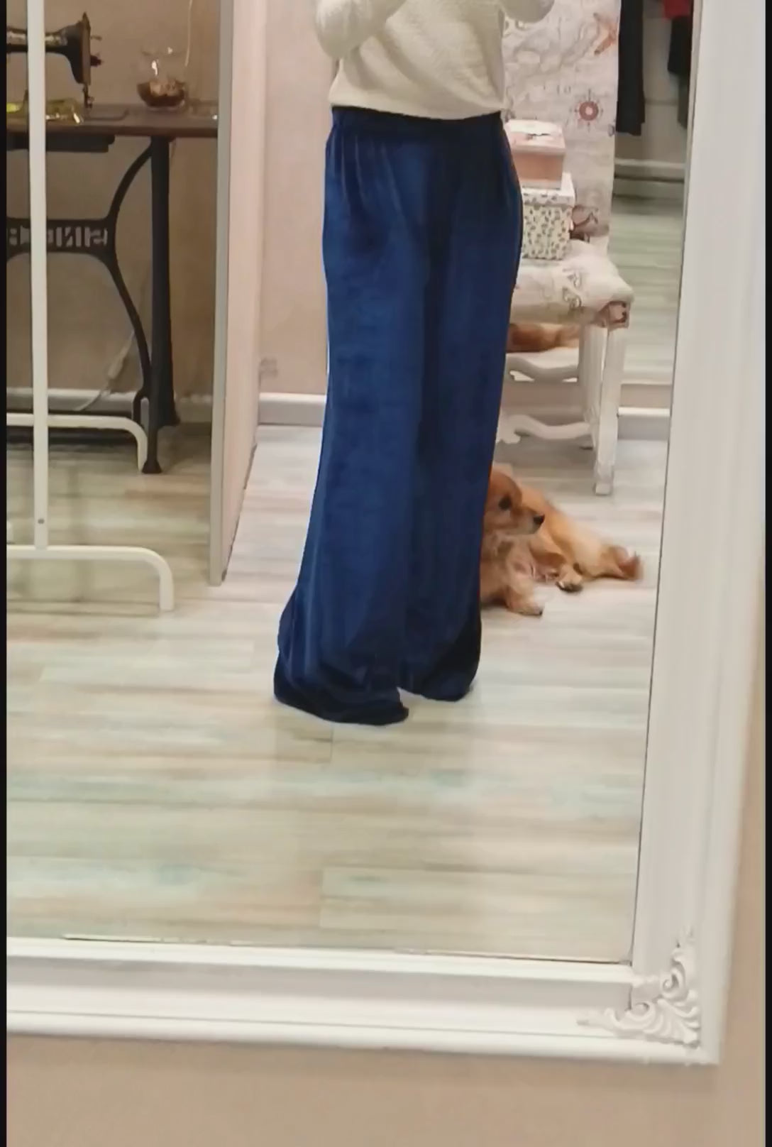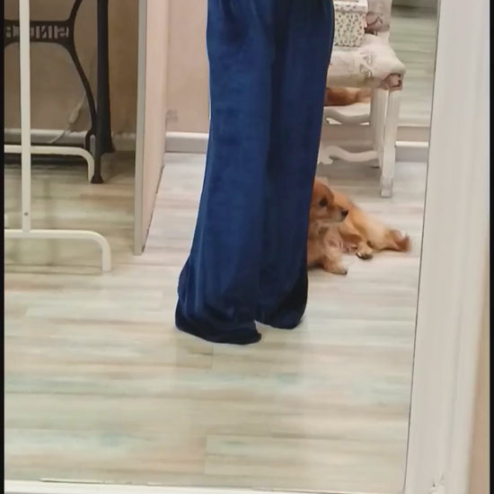 Pantalone dalla linea morbida, tipo palazzo, con elastico in vita realizzato in un bellissimo velluto bluette o colore ciclamino. Elegante ma allo stesso tempo comodissimo da indossare