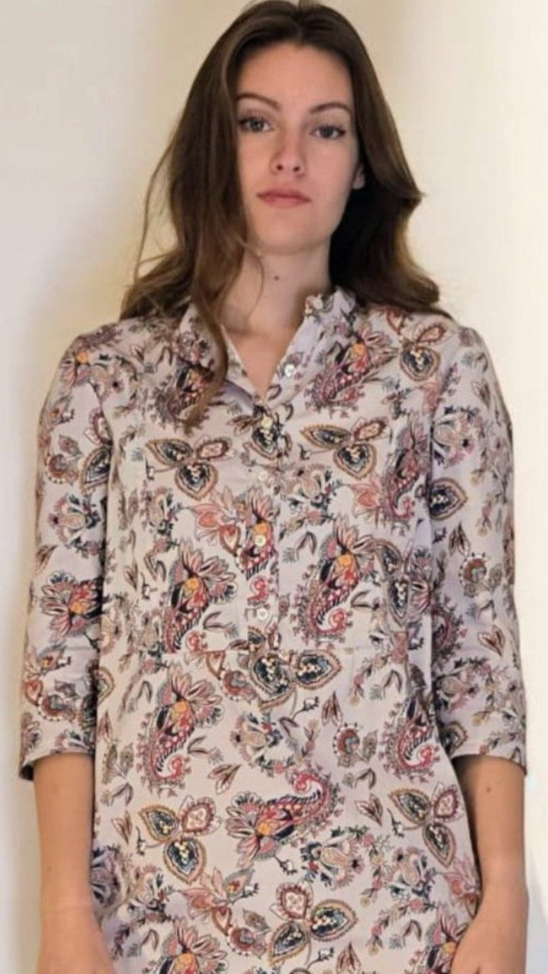 Colletto alla coreana, apertura nel centro davanti chiusa da 6 bottoncini di madreperla, maniche a tre quarti e spacchi stondati nei fianchi caratterizzano questa blusa. È disponibile in quattro taglie di larghezza: XS (38/40); S(40/42); M (42/44); L(44/46) ( Vedi tabella taglie per riferimento misure) e tre taglie di lunghezza: Corta, Media e Lunga a seconda della vostra altezza e della vostra lunghezza del busto. Verrete contattate dopo l'ordine (lasciate mail o numero di cellulare)e vi spiegheremo come prendere correttamente la misura per determinare in quale taglia di lunghezza rientrate.